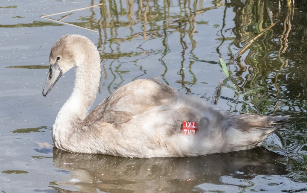 Over the next few months the cygnets will be moving out of the reserve and with the coloured rings it will be easier for these to be read. Hopefully we will get reports back as to where our cygnets end up. You will notice on the picture above there are rings on both legs, the metal ring has the ‘normal’ ringing number, the coloured ring is for easier recognition from distance.