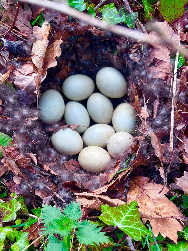 Also walk in the woods disturbed a female Mallard which was sitting on 10 eggs.